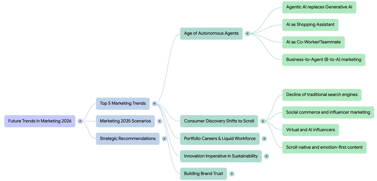 And for those of you who don't like listening either, I asked it to generate a "mindmap" delineating the thinking behind the report, branching out what the AMA told me were the two top of Big 5 trends addressed in the report: the "Age of Autonomous Agents;" and "Consumer Discovery Shifts To Scroll."