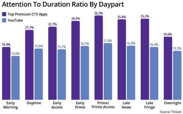 Other dayparts surveyed also show higher attention scores for premium streamers versus YouTube.