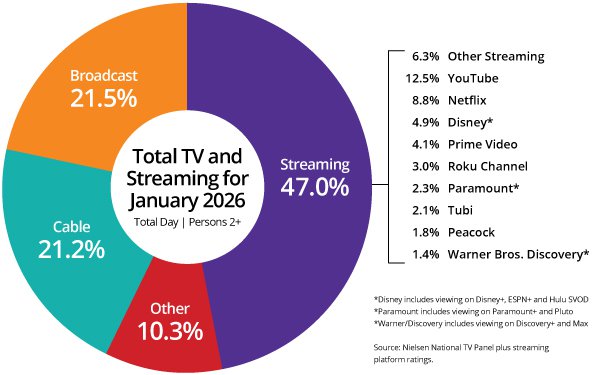 A number of streamers showed year-over-year gains. YouTube remained in the top spot with 12.5% (vs. 10.8% in January 2025), while Netflix was next at 8.8% (versus 8.6%) and Disney, for all its platforms, came in at 4.9% (4.7%), while Prime Video had 4.1% (3.7%); Roku, 3.0% (2.1%), and Tubi, 2.1% (1.7%).