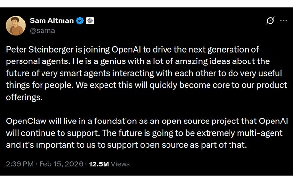 Altman wrote that OpenClaw, an open-source AI agent framework that recently became one of the fastest-growing projects in GitHub, will live as the foundation of an open-source project that OpenAI will continue to support.